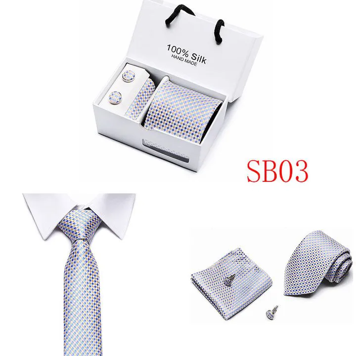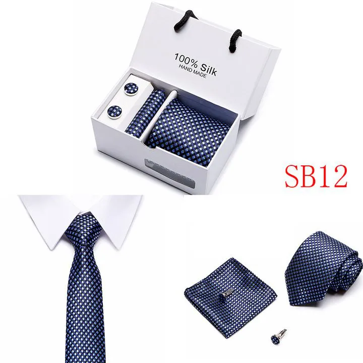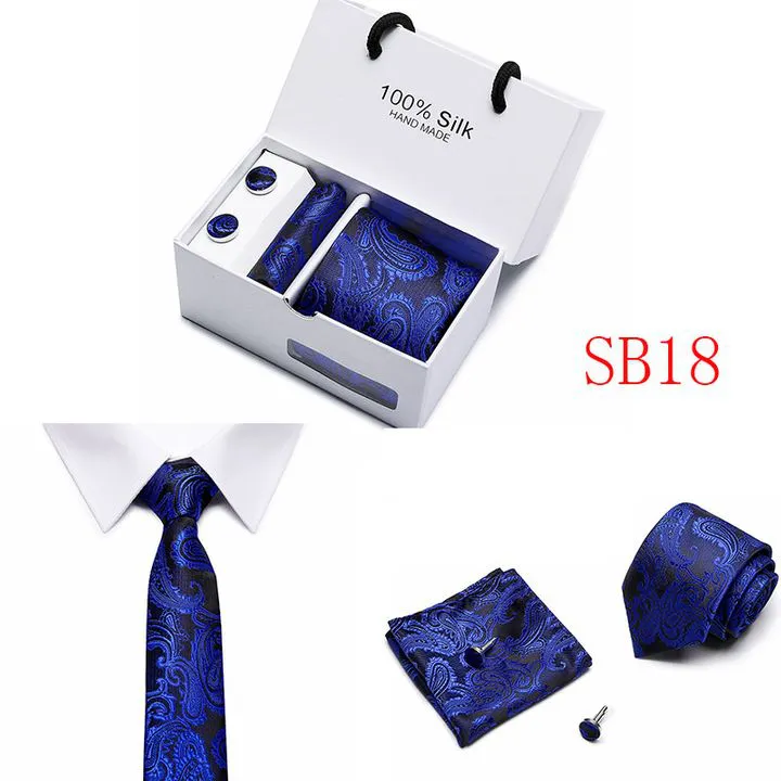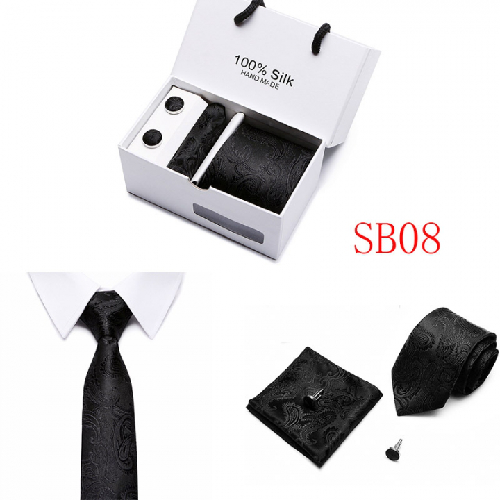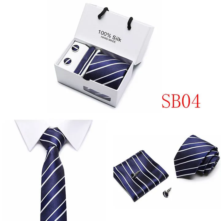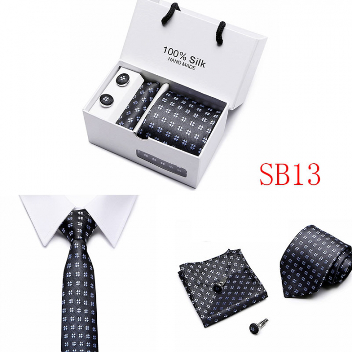 Set includes tie, square, cufflinks, white gift box Tie size: 146×7.5×3.5cm Square scarf size: 25x25cm Cufflink size: 1.5cm Box size: 12.5×8.5x8cm This batch of tie uses high-density polyester silk fabric, three-dimensional cutting, machine stitching, extremely high density, exquisite workmanship, tie is not easy to loose, deformation, you can rest assured to buy