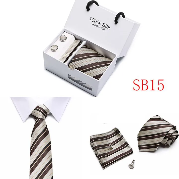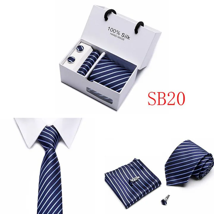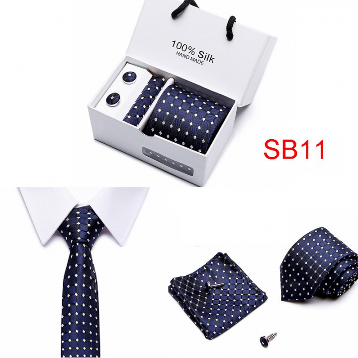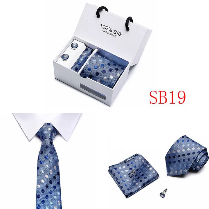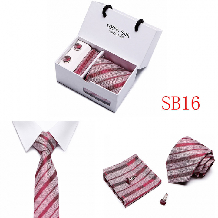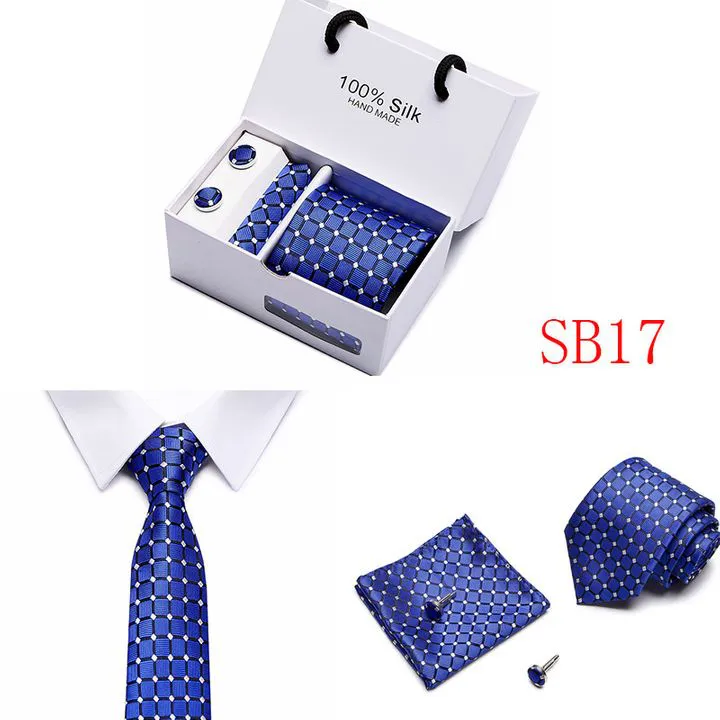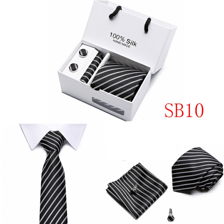 Set includes tie, square, cufflinks, white gift box Tie size: 146×7.5×3.5cm Square scarf size: 25x25cm Cufflink size: 1.5cm Box size: 12.5×8.5x8cm This batch of tie uses high-density polyester silk fabric, three-dimensional cutting, machine stitching, extremely high density, exquisite workmanship, tie is not easy to loose, deformation, you can rest assured to buy