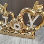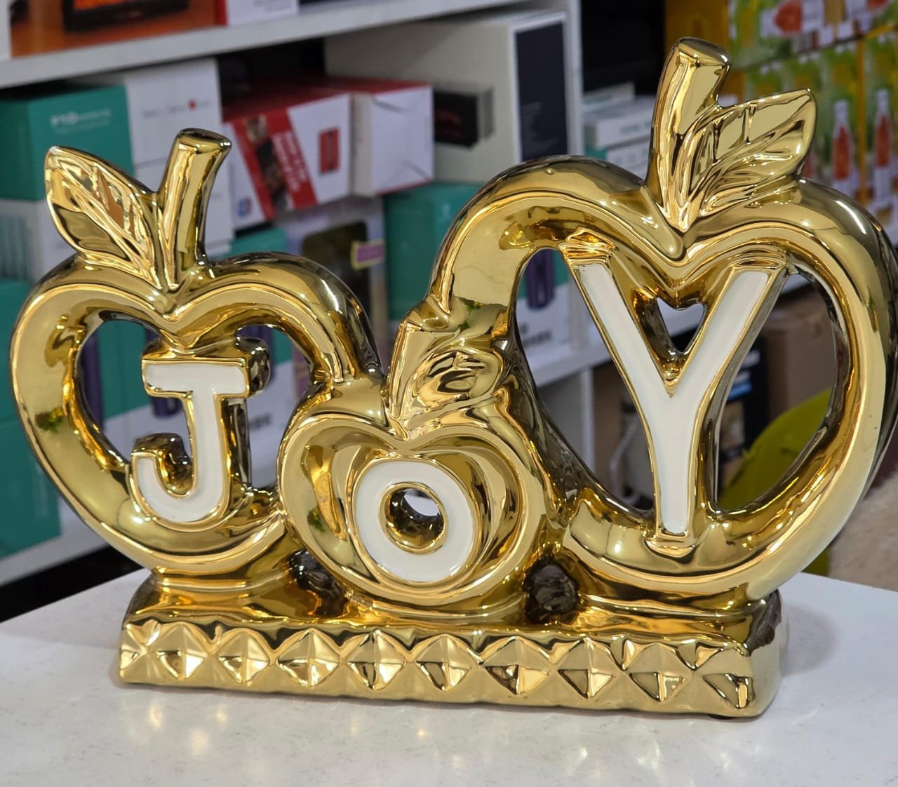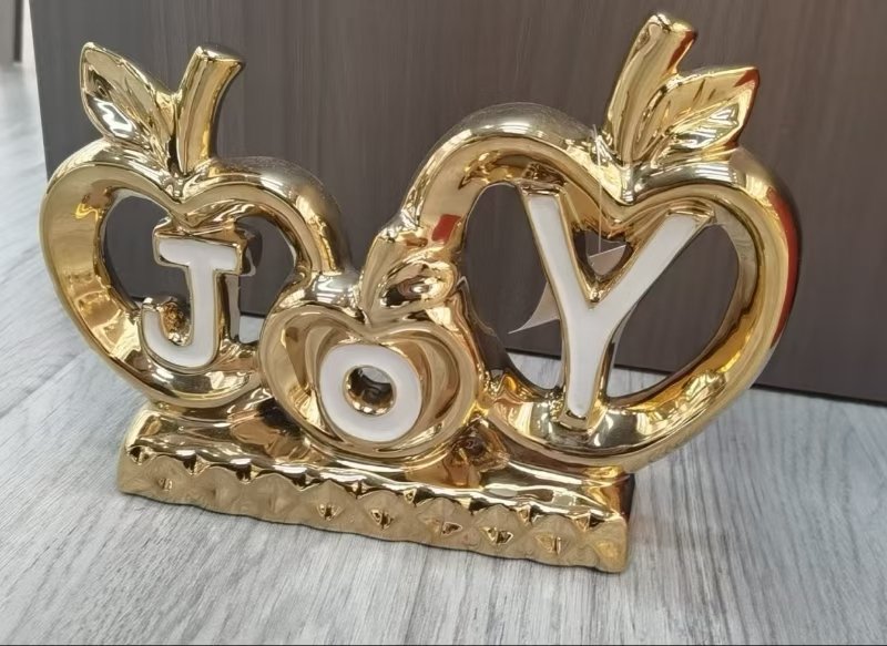 Celebrate positivity and elegance with this stunning golden JOY decorative ornament. Crafted from high-quality ceramic with a glossy gold finish, this piece features the word “JOY” beautifully designed inside apple-shaped frames. A perfect addition to your living room, dining area, or office, it adds a touch of luxury and charm to any space. Ideal as a centerpiece, shelf decor, or a thoughtful gift for special occasions, this ornament brings both style and meaning to your home
